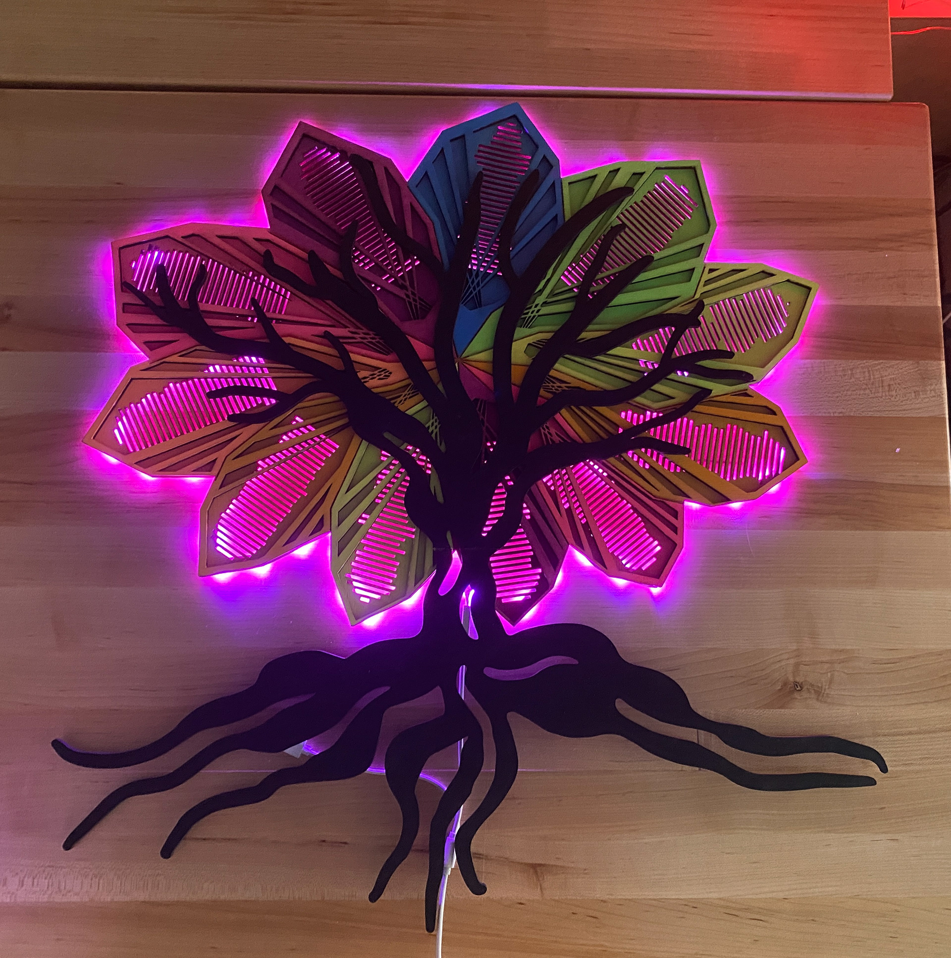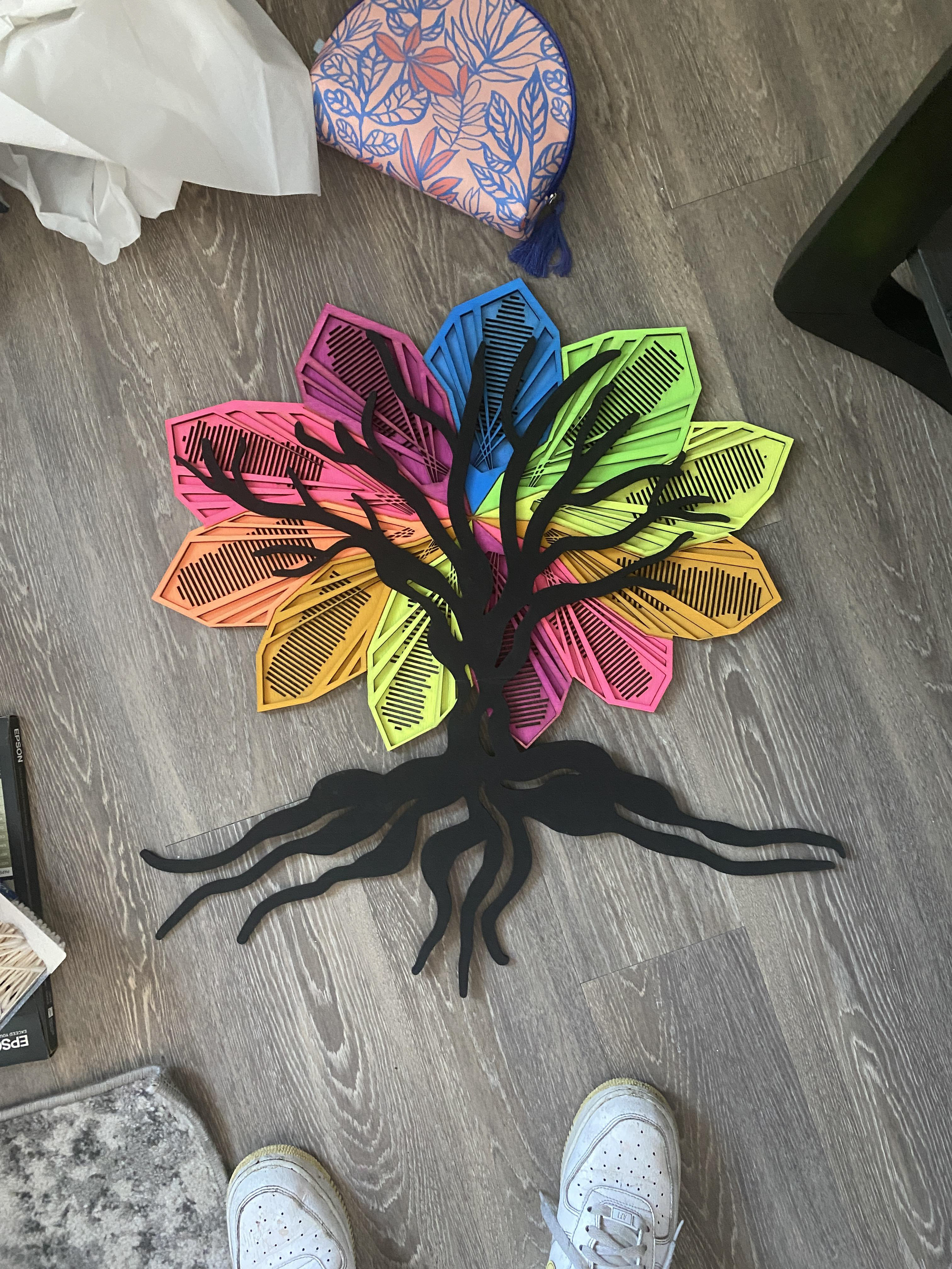After much trial and error, my True Colors Tree was complete! The LED lights sync up to music, so they change color to the beat of any song on the album. This project looked very different in my head originally. I thought I would be using the CNC machine and creating a 2 by 4 ft art piece. I’m glad it ended up being smaller because I can hang it up anywhere after I move out of my apartment. I learned to work through frustration and to persevere when plans changed. I also feel very comfortable using the laser cutter. This project was out of my comfort zone but it turned out better than I could imagine.